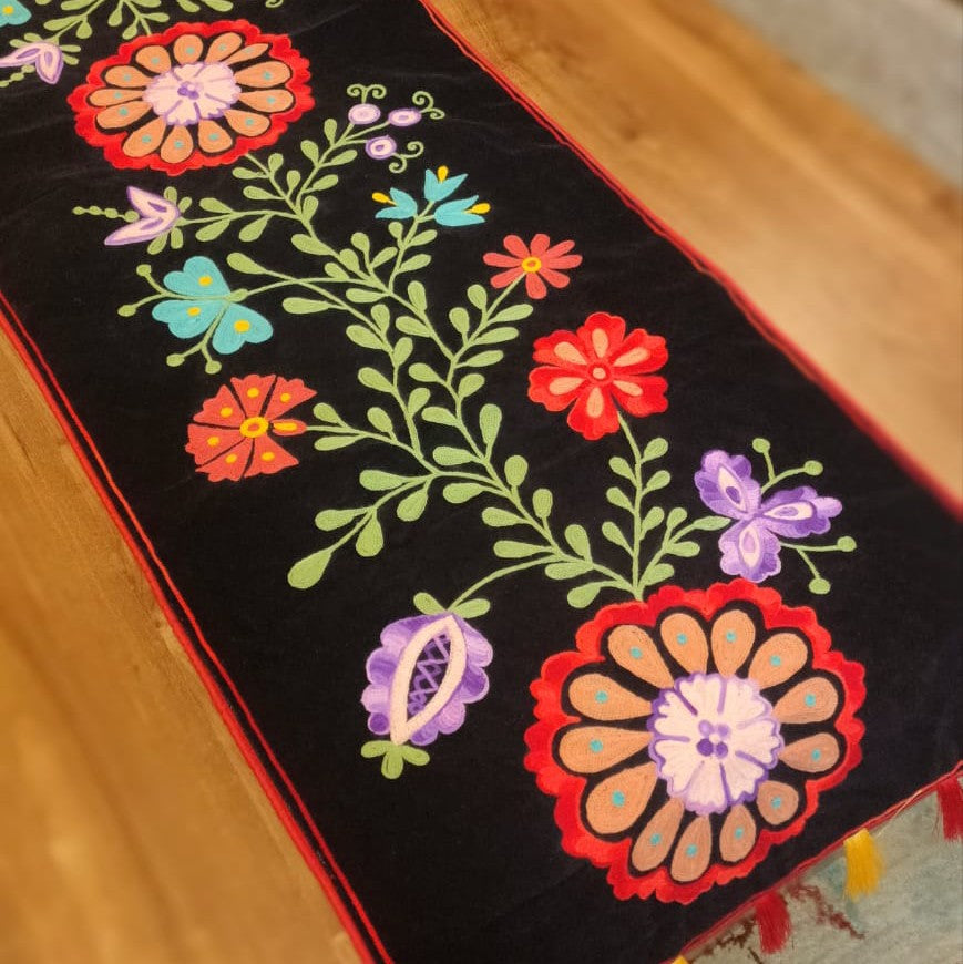 Black Velvet Table Runner with Floral Hand Kashmiri Embroidery -16"